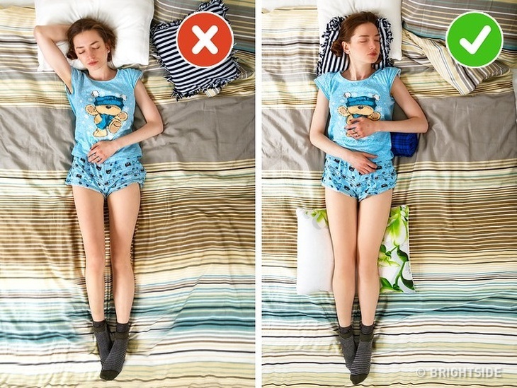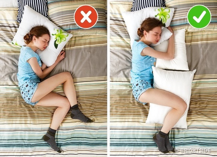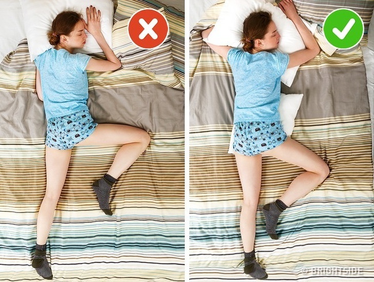 Để tránh tình trạng này, hãy gối đầu bằng một cái gối to mềm, sau đó ôm một gối nhỏ và cứng giữa hai chân. Tư thế này giúp giữ lưng thẳng khi nằm nghiêng, giảm áp lực lên các khớp và cơ quan nội tạng ngày cả khi bạn nghiêng sang trái hay phải.