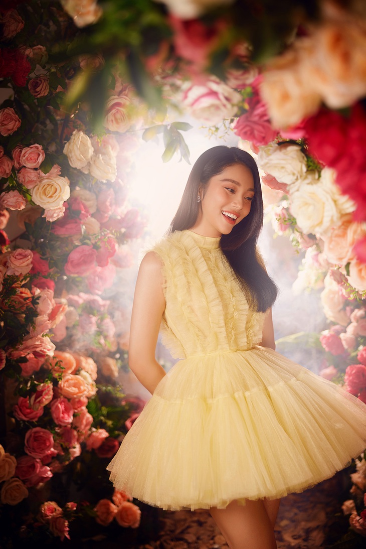 Còn khi khoác lên mình bộ đầm ngắn xòe màu vàng, hình ảnh Lâm Thu Hồng lại trở nên năng động, nhiều sức sống hơn.
