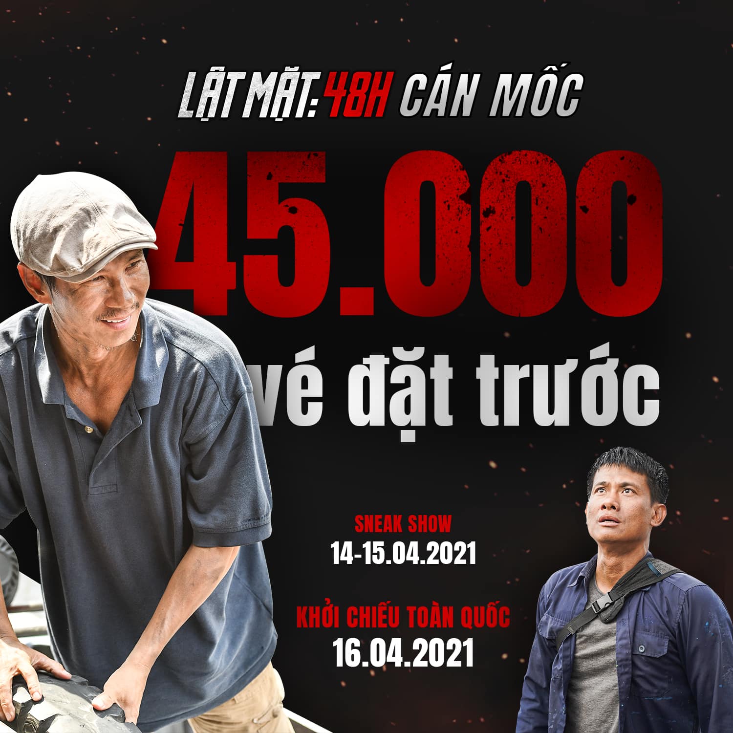 Số lượng vé bán trước của Lật mặt 48H đạt hơn 45 ngàn véĐiều này giúp cho Lật mặt: 48h vượt qua doanh thu của Bố già - phim Việt duy nhất đang thống trị phòng vé với hơn 400 tỷ doanh thu. Bên cạnh đó, đứa con tinh thần thứ 5 của Lý Hải cũng vượt mặt luôn cả các bom tấn Hollywood như: Godzilla vs. Kong, Mortal Kombat đang gây sốt phòng vé.