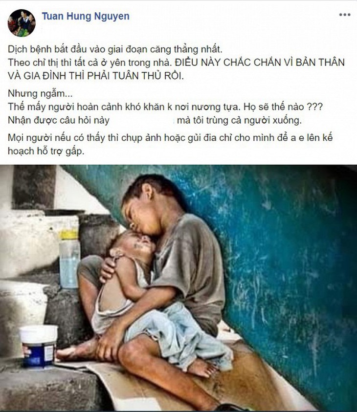 Ca sĩ Tuấn Hưng cũng thông qua trang cá nhân để kêu gọi giúp đỡ cho những người lao động nghèo: "Dịch bệnh bắt đầu vào giai đoạn căng thẳng nhất. Theo chỉ thị thì tất cả ở yên trong nhà. Điều này chắc chắn vì bản thân và gia đình thì phải tuân thủ rồi.
