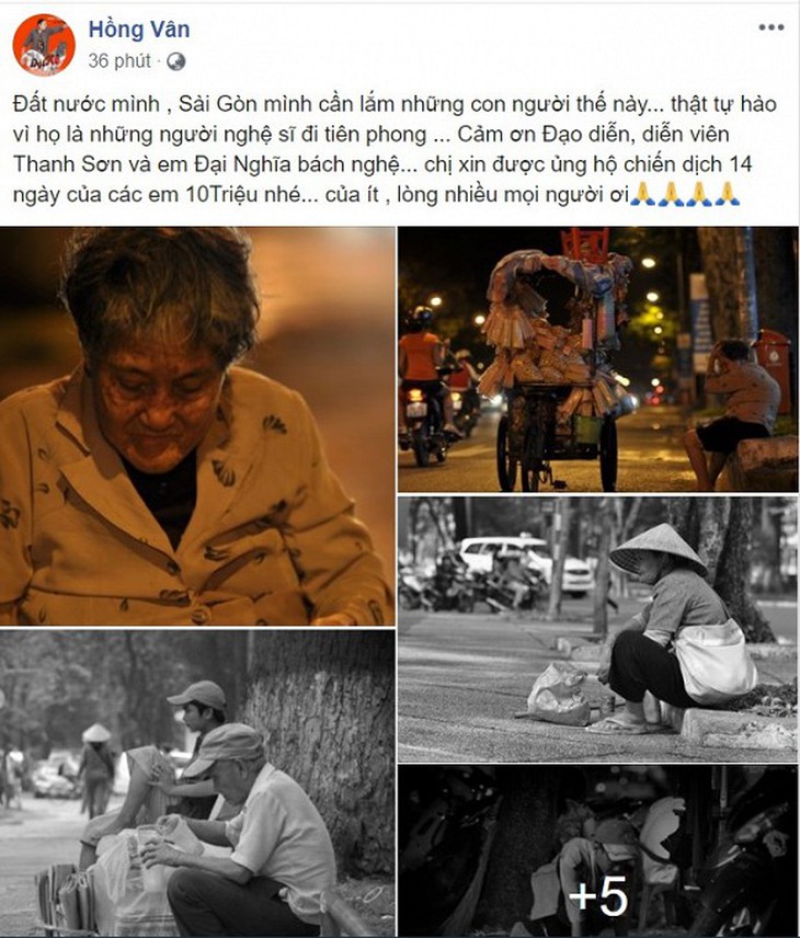 Trên trang Facebook cá nhân, nghệ sĩ Hồng Vân chia sẻ dòng trạng thái tự hào về những nghệ sĩ tiên phong trong việc giúp đỡ những người bán vé số và hàng rong trước lệnh cấm tụ tập đông người và dừng phát hành xổ số kiến thiết trong 15 ngày. Nghệ sĩ Hồng Vân viết: "Đất nước mình, Sài Gòn mình cần lắm những con người thế này, thật tự hào vì họ là những người nghệ sĩ đi tiên phong. Cảm ơn đạo diễn, diễn viên Thanh Sơn và em Đại Nghĩa bách nghệ. Chị xin được ủng hộ chiến dịch 14 ngày của các em 10 triệu nhé. Của ít, lòng nhiều mọi người ơi".
