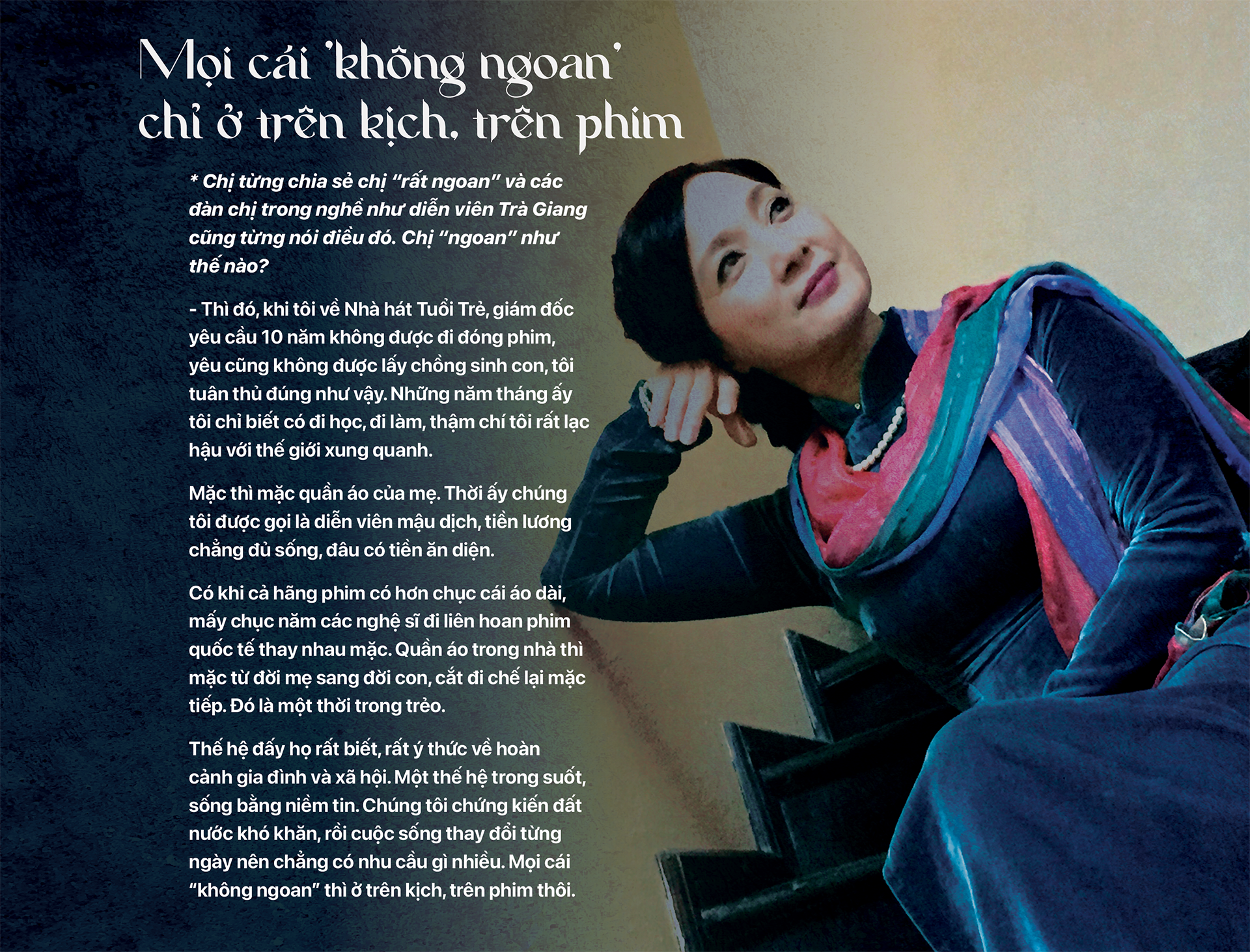 Trời ơi cuộc sống trôi nhanh như vậy, cứ ngồi một chỗ mà đợi rồi nghĩ tới ngày xưa thì tự mình loại mình khỏi cuộc chơi. Đời làm nghệ thuật chuyên nghiệp không phải là đóng khung mình vào một loại nhân vật, một dòng phim.