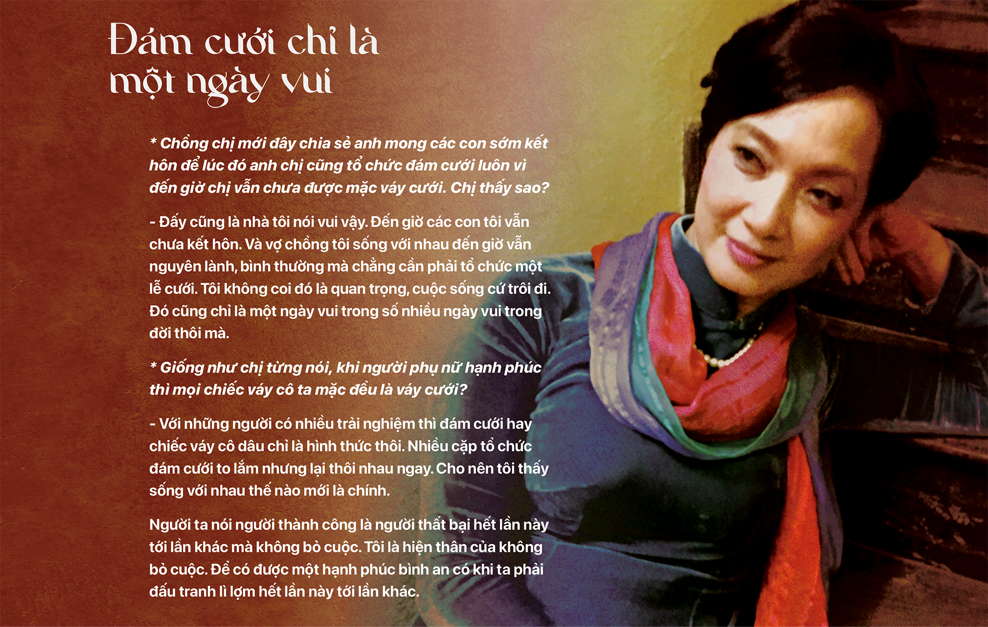 Đời vô thường như thế thì hãy sống tích cực, tranh thủ mà hưởng chứ. Ai biết đâu ngày mai. Tôi vỡ ra những điều này từ sớm. Tôi sớm chọn cho mình một đời sống bình an vì hồi bé mình đã nhìn thấy người lớn không bình an.