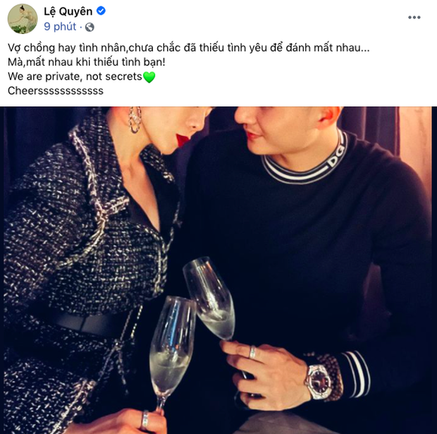 Cô viết đầy ngọt ngào: "Vợ chồng hay tình nhân chưa chắc đã thiếu tình yêu để đánh mất nhau. Mà mất nhau khi thiếu tình bạn! We are private, not secrets. Cheers! (Chúng tôi giữ kín chuyện riêng tư, không phải là điều bí mật. Nâng ly!".