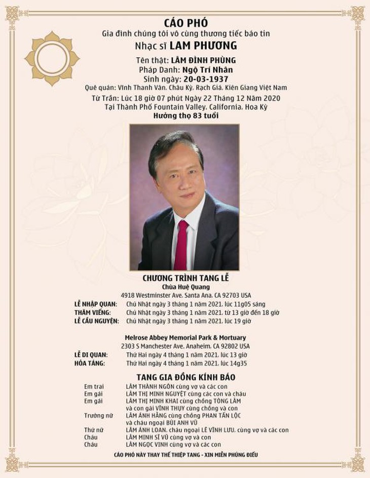 Lễ tang nhạc sĩ Lam Phương được tổ chức ở cả Việt Nam và Mỹ