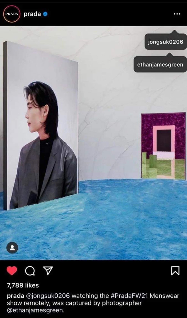 Bên cạnh việc bóc phốt Trịnh Sảng từng có thời gian hẹn hò với Lee Jong Suk và cả hai chỉ dừng ở mối quan hệ “bạn tình", “bạn sex" thì ở diễn biến khác, phía thương hiệu thời trang Prada (thương hiệu thời trang mà Trịnh Sảng đang làm đại sứ) đã bất ngờ chia sẻ hình ảnh Lee Jong Suk mặc trang phục của hãng một ngày trước.