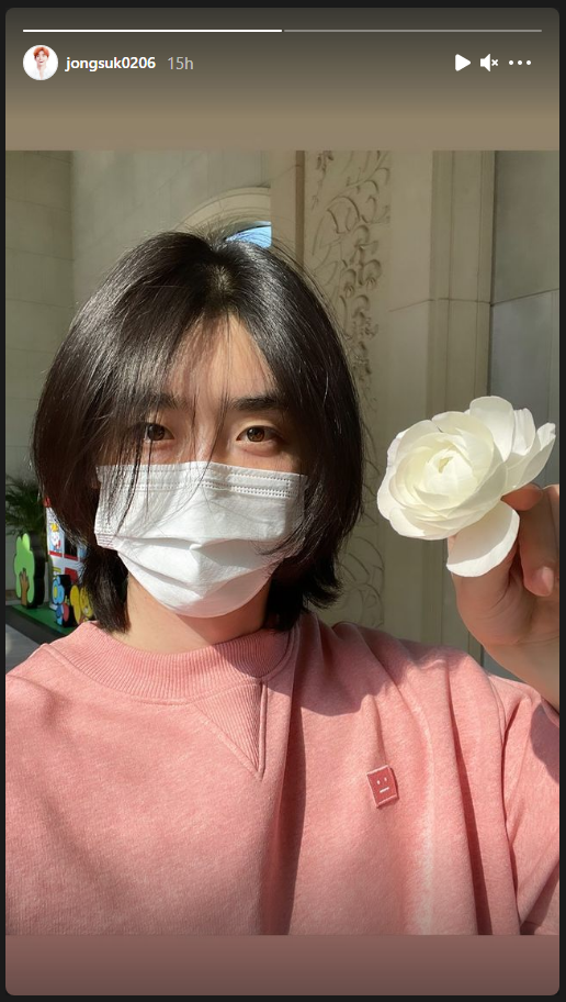 "Giao diện" mới tinh của mỹ nam màn ảnh Hàn vừa cập nhật đã khiến fangirl cười nghiêng ngả. Trong ảnh, nam diễn viên mặc áo len trơn màu hồng phấn và không quên cài một bông hoa trắng trên tai. Nhưng được chú ý hơn cả là mái tóc dài suôn thẳng, bóng mượt của anh chàng.