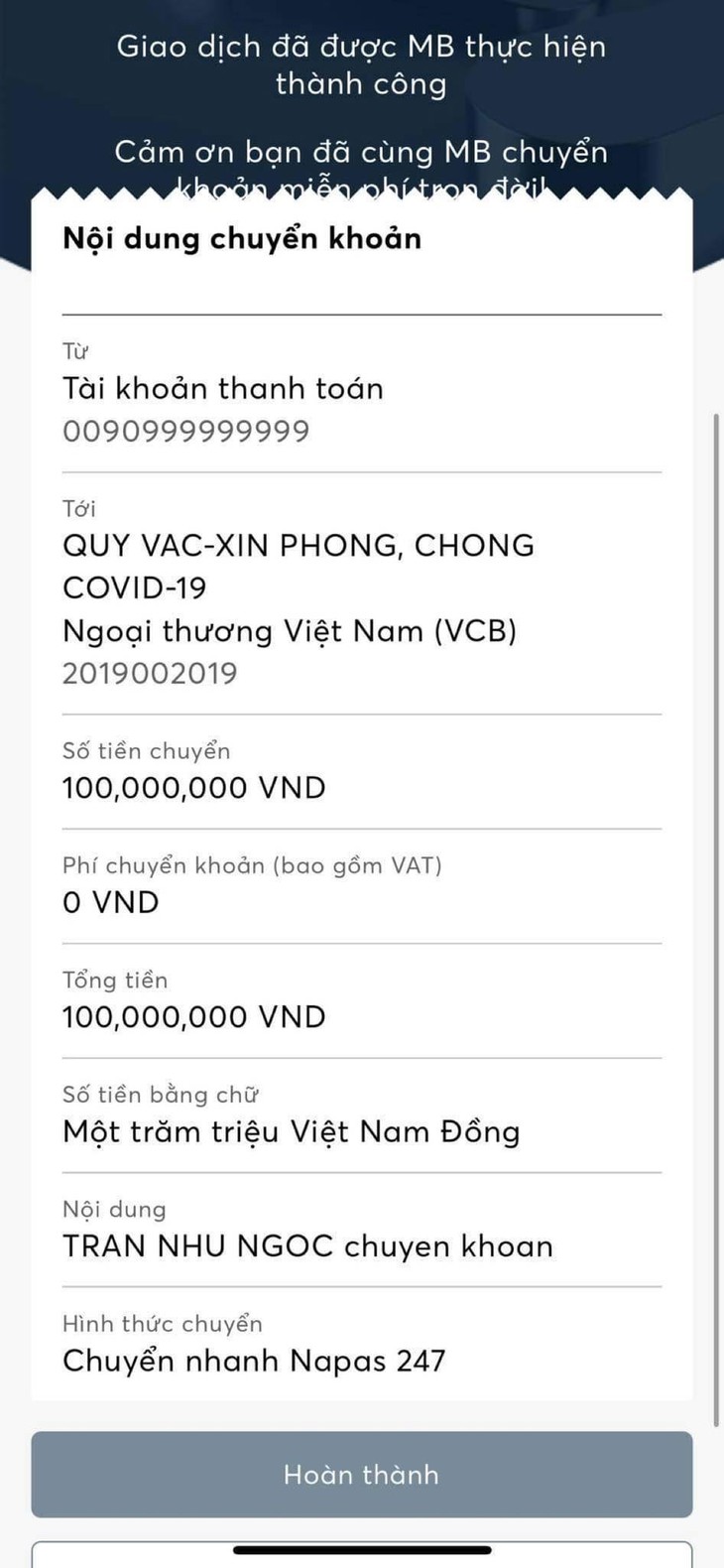 Dù hứa thắng sẽ chuyển 100 triệu đồng cho Quỹ vaccine phòng chống COVID-19, thế nhưng Lily Chen đã "lật kèo" - vẫn ủng hộ quỹ, khi biết tỉ số chung cuộc của đội nhà, thua 2-3 trước UAE. (Ảnh: NVCC)Tuy nhiên, kết quả chung cuộc là 3-2 và lại nghiêng về đối thủ UAE. Nữ ca sĩ khẳng định: "Việt Nam nói là làm, dù tỉ số không như mong đợi nhưng tôi vẫn ủng hộ 100 triệu đồng vào Quỹ vaccine của nước nhà. Số tiền tuy nhỏ nhưng tôi hy vọng sẽ lan toả tinh thần đến cộng đồng".