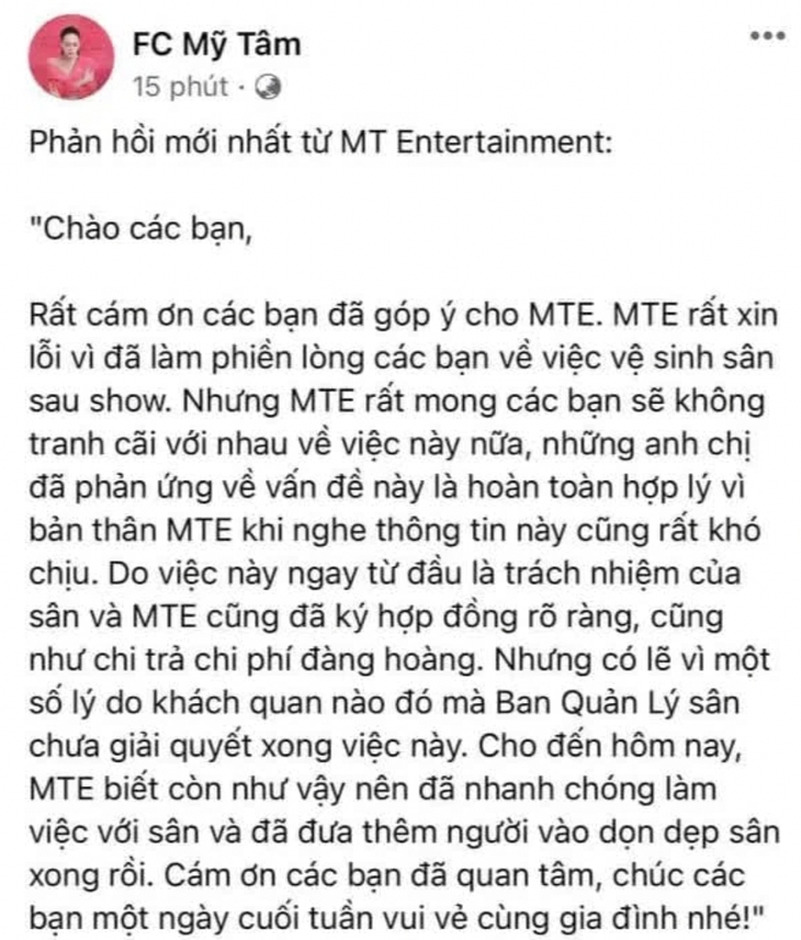 Liveshow để lại đống rác trên sân vận động, phía Mỹ Tâm nói gì?