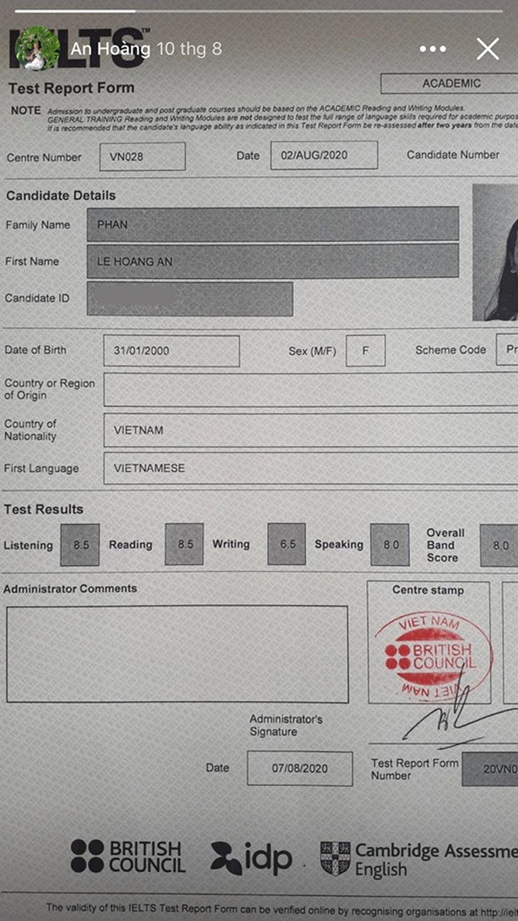 Hiện tại, Hoàng An đang theo học chuyên ngành Quan Hệ Quốc Tế tại Đại học Khoa học Xã hội và Nhân Văn - ĐHQG TP.HCM. Cô có thể giao tiếp tốt 2 ngôn ngữ là tiếng Anh và tiếng Tây Ban Nha. Ấn tượng hơn cả là bảng điểm IELTS của Hoàng An là 8.0. Trong đó, hai kỹ năng nghe và đọc đạt 8.5 điểm, thành tích của cô vượt mặt luôn cả hoa hậu Lương Thuỳ Linh với IELTS 7.5.