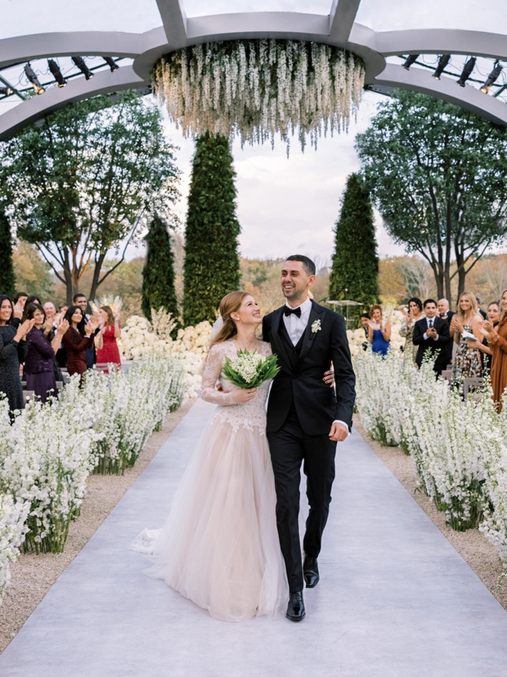 Cô dâu diện chiếc váy là một thiết kế của Vera Wang, còn chú rể Nassar mặc vest đen lịch lãm.