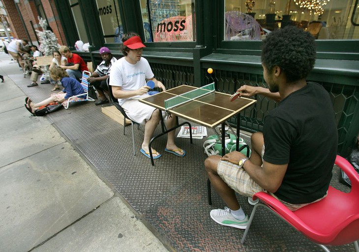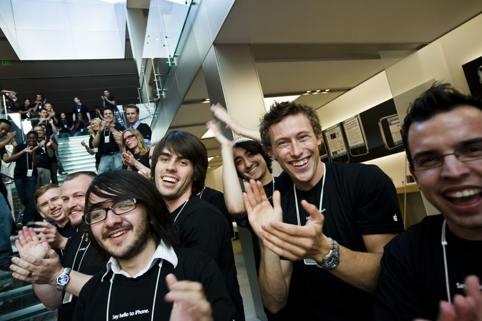 Nhân viên của Apple Store chào đón những vị khách đầu tiên đến mua iPhone tại San Francisco.Steve Jobs đã mất. Tim Cook là người thay thế vị trí của người tiền nhiệm. Hàng loạt mẫu iPhone xuất hiện liên tục qua từng năm. Và người dùng hiện tại chẳng cần phải xếp hàng như xưa để có được chiếc điện thoại mình ưa thích, nhất là trong bối cảnh COVID-19 vẫn đang hoành hành. Việc bạn cần chỉ là đặt hàng và chờ đợi.