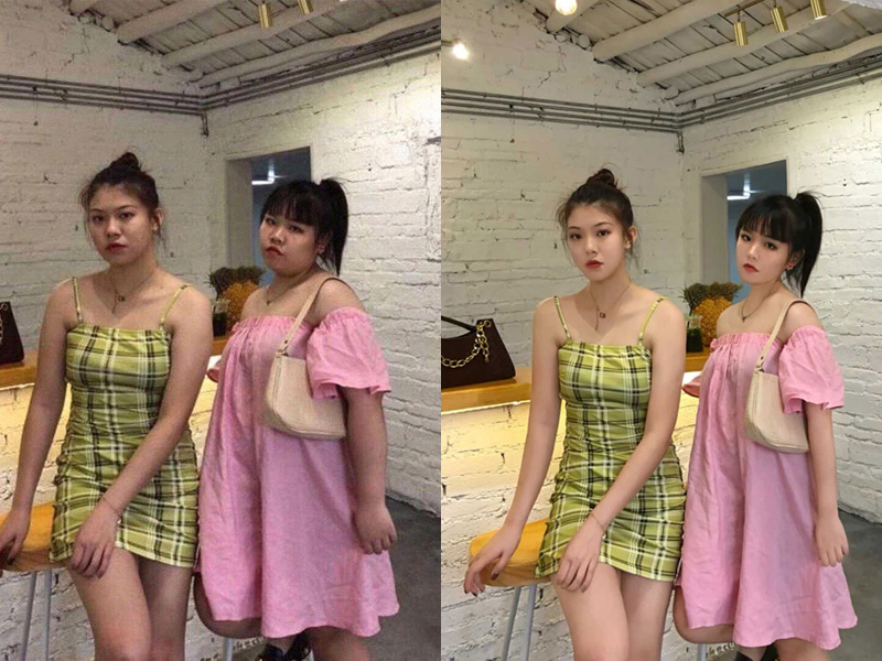 Mới đây nhất, mạng xã hội Trung Quốc cũng một phen tá hỏa khi gương mặt thật của hai cô gái từng xinh lung linh được hé lộ. So với những bức ảnh được chỉnh sửa kỹ càng đăng tải trên mạng xã hội, vẻ ngoài của cả hai cô trông kém sắc hẳn, chẳng thấy một nét nào giống, ngoại trừ... trang phục!