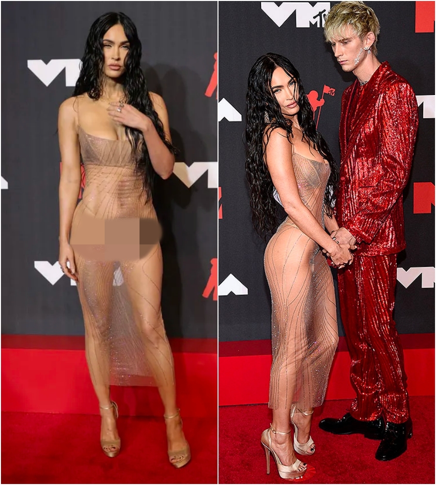 Xuất hiện bên tình trẻ Machine Gun Kelly, Megan Fox tận dụng bộ đầm xuyên thấu khoe trọn ba vòng căng tràn không chút mỡ thừa khiến người xem đỏ mặt.
