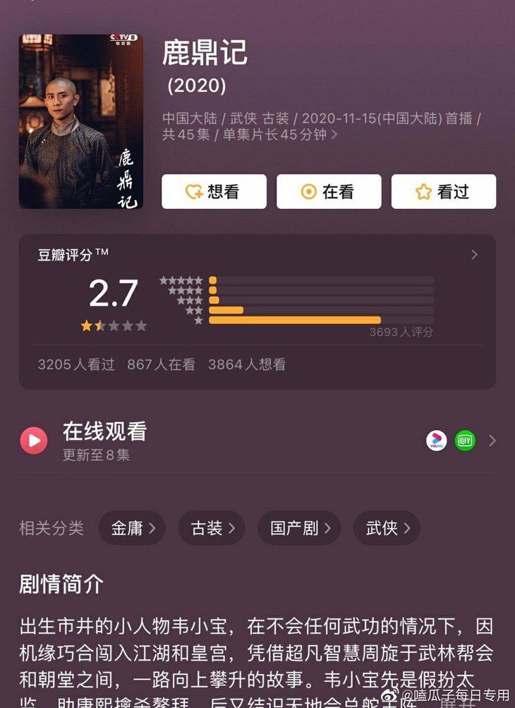 Với điểm số quá thấp này, nhiều người tin rằng Lộc đỉnh ký sẽ nắm chắc danh hiệu "phim dở nhất năm 2020" và cũng là tác phẩm Kim Dung được chuyển thể gây thất vọng nhất hiện nay.