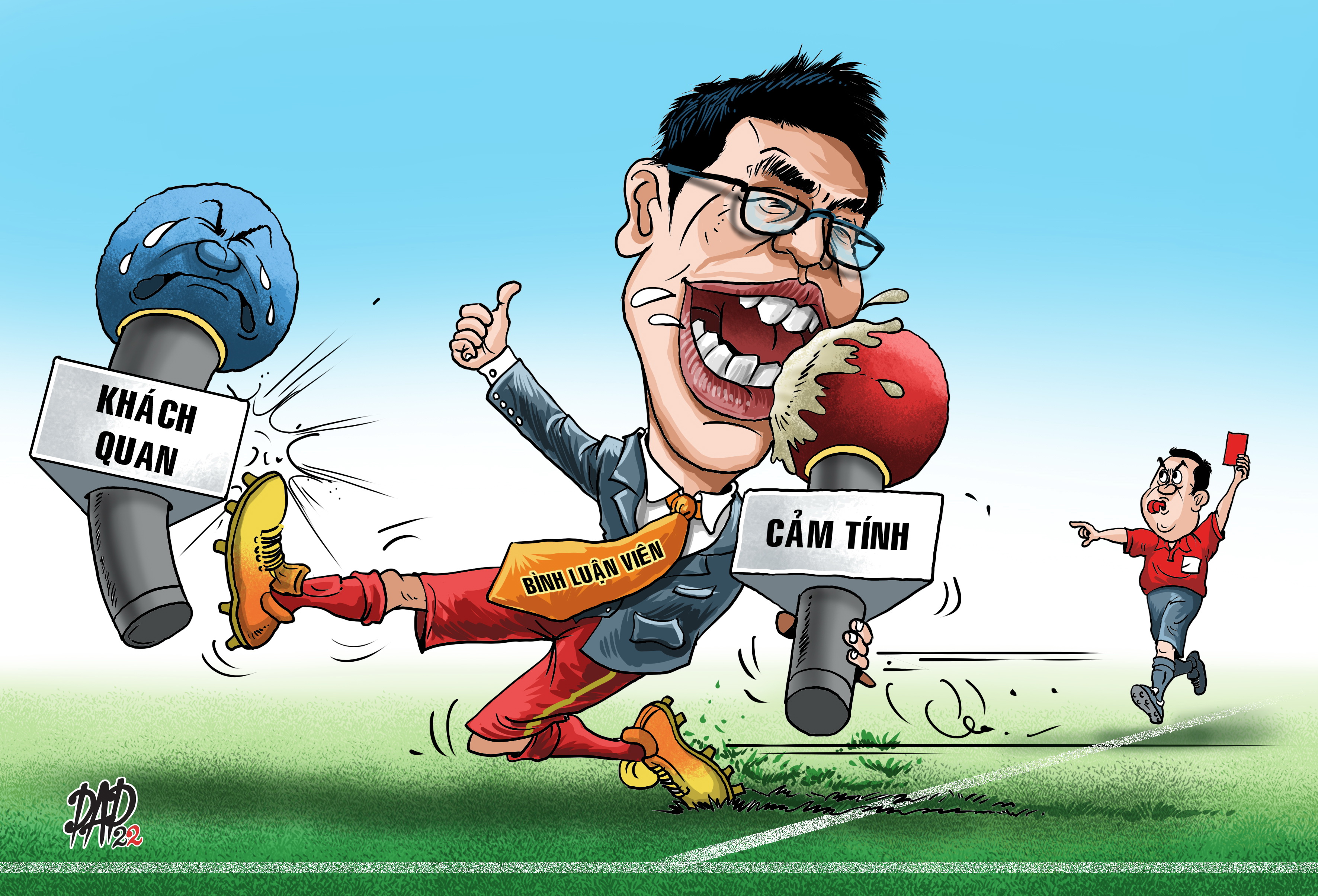 TTCT - Nghề bình luận viên đòi hỏi sự khách quan và cân bằng giữa lý tính và cảm tính. 1. Nhà báo Huỳnh Sang: “Cố giữ lấy lề cho nghề bình luận”Đầu năm 2022, tôi phối hợp với Trường đại học Khoa học xã hội & nhân văn mở một khóa đào tạo BLV bóng đá. Khóa học này chỉ kéo dài khoảng 2 tháng (hơn 100 tiết) nhưng tôi cố gắng mời về nhiều chuyên gia bóng đá tên tuổi như cựu trọng tài Võ Minh Trí, HLV Đoàn Minh Xương, bình luận viên Quang Huy… Biếm họa của DADVới số học viên chỉ khoảng 20, lại mời được nhiều chuyên gia, mục đích của tôi khi mở khóa đào tạo chủ yếu là vì cộng đồng, góp một phần giữ lấy cái chuẩn mực cho nghề này.Nghề bình luận bây giờ có thể nói là nở rộ, trên các trang mạng xã hội, rồi bình luận bóng đá phủi… Nhưng người có kiến thức đầy đủ về bóng đá có thể nói là rất ít. Để bình luận một cách công tâm, ngoài đạo đức các BLV còn cần kiến thức. Chẳng hạn một số tình huống mà trọng tài thổi bất lợi cho đội tuyển Việt Nam, cảm xúc đầu tiên của chúng ta luôn là bất mãn. Nhưng một BLV có hiểu biết về luật sẽ có thể chững lại để đưa ra nhận định chính xác, tránh bị cuốn theo cảm xúc.Ví dụ như tình huống Quế Ngọc Hải phạm lỗi trong trận bán kết AFF Cup với Thái Lan hồi năm ngoái. Trước đó, hậu vệ Bunmathan của Thái chơi tiểu xảo với cầu thủ Việt Nam khiến người hâm mộ ai cũng giận dữ. Nhiều người thông cảm cho pha trả đũa của Hải sau đó, nhưng người hiểu luật sẽ biết rằng phạm lỗi kiểu vậy có thể dẫn đến hình phạt nặng và lại rất rõ ràng. Bản lĩnh của một cầu thủ nằm ở những tình huống như vậy và bản lĩnh của một BLV cũng vậy.2. BLV Quang Huy: “Phải luôn trân trọng những bàn thắng”Khi bình luận trận đấu có đội tuyển của đất nước mình, chuyện công tâm 100% là rất khó. Nhưng tôi luôn tự nhủ mình phải có cách diễn đạt làm sao đó về câu từ để không ai bắt bẻ được. Về sắc thái, giọng nói, độ sôi nổi thì tất cả cũng hiểu ra mình đang ủng hộ đội nào, nhưng chúng ta cũng không thể quá thiên lệch. Ít ra, khi thấy đội đối phương ghi bàn tôi vẫn cố hô cao giọng lên một chút.Bàn thắng vẫn là cái đẹp nhất của bóng đá, không có bàn thắng thì bóng đá chẳng còn gì cả. Bàn thắng của đội bạn đẹp thì cũng phải mô tả đẹp, nêu ra vấn đề về hàng phòng ngự của mình, và cần phải phân tích cả hai phía, Việt Nam ghi bàn không chỉ nói cái hay của Việt Nam mà còn phải nêu ra vấn đề của đối thủ. Ngược lại, khi Việt Nam bị thủng lưới cũng phải nói đến sai lầm của Việt Nam và cái hay của đối thủ.Khi trận đấu kết thúc, tôi có lắng lại, tham khảo dư luận nói thế nào. Cá nhân tôi rất hay theo dõi mạng xã hội để biết khán giả cần và muốn biết gì. Tuy nhiên, tất cả chỉ là tham khảo. Tôi vẫn xác định là phải làm việc cho tốt. Cố gắng đi theo hướng đi được xã hội thừa nhận chứ không phải là giành giật sự thừa nhận trên mạng xã hội.Bản chất con người sao thì bình luận cũng như vậy. BLV ít đùa trong cuộc sống thì cũng nên làm việc điềm đạm, ít pha trò. Mỗi người một phong cách, cố gắng giữ đúng bản chất, không nên gồng lên thể hiện quá nhiều sẽ trở nên mất thăng bằng. Phải tự nhiên và sẽ được ghi nhận. Không thể là người trầm trầm nhưng vô trận là thích bình luận kiểu bốc đồng, nói những điều tếu táo.3. Cựu tuyển thủ quốc gia Đặng Phương Nam: “BLV phải không ngừng học hỏi”Cái khó của BLV là chuyên môn mỗi người khác nhau nên nhận định cũng sẽ khác nhau trong cùng một sự việc. Nhưng cho dù thế nào, bình luận trung thực và công tâm vẫn được đặt lên hàng đầu. Mỗi BLV sẽ cố gắng đưa ra nhận định chuẩn xác nhất để người hâm mộ nghe và hiểu được vấn đề. Đặc biệt là những vấn đề liên quan đến quyết định của trọng tài, vì nếu bình luận sai lệch có thể dẫn đến việc công kích cá nhân.Chẳng hạn như một trận đấu của đội tuyển Việt Nam, tôi không thể nào đứng về phía CĐV để chỉ trích quyết định của trọng tài khi họ rút thẻ đỏ hoặc thổi 11m cầu thủ đội nhà, mà cần dựa theo luật. Điều này thì tôi cũng có lợi thế bởi từng là cầu thủ, rồi chuyển sang làm công tác huấn luyện và trở thành BLV, vốn cũng cần phải cập nhật kiến thức và Luật bóng đá.Tôi nghĩ nghề bình luận có 30% liên quan đến kiến thức. Do đó, tôi phải học hỏi và rèn luyện hằng ngày. Thật ra, bình luận trận đấu không phải thế mạnh của tôi, mà là mổ băng, phân tích chiến thuật, tư vấn cho bản tin thể thao và làm game show bóng đá.Có những BLV có khả năng truyền tải cảm xúc rất tốt mà tôi phải học khi bình luận về đội tuyển Việt Nam. Nhưng nếu họ không chú ý đến chuyên môn, phân tích tình huống thì cũng khó làm hài lòng khán giả vốn ngày càng am hiểu. Như cầu thủ sút mu chí
