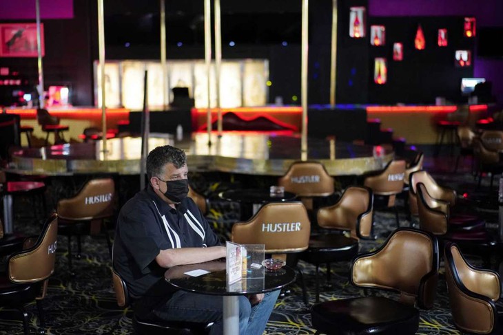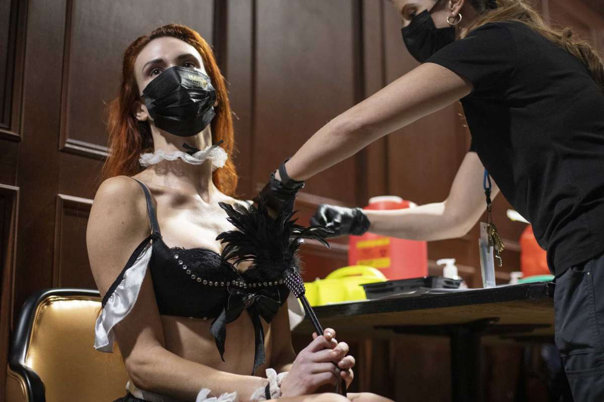 Trong trang phục sexy và giày cao gót, vũ công JoJo Hamner kiên nhẫn ngồi xếp hàng chờ tới lượt chị được tiêm vắc xin COVID-19, ở điểm tiêm được mở tại hộp đêm thoát y Larry Flynt's Hustler Club - một trong những điểm phục vụ nhảy múa thoát y có tiếng nhất tại thành phố Los Angeles, bang California, Mỹ.