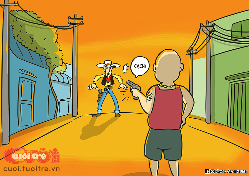 Mặt gã đằng đằng sát khí. Không nói tiếng nào, gã cưỡi bò rút nhanh khẩu súng, trong khi Luke còn chưa kịp hiểu chuyện gì. Họng súng đen ngòm kèm theo tiếng quát : "Mày biết bố mày là ai không? Chán sống à?".
