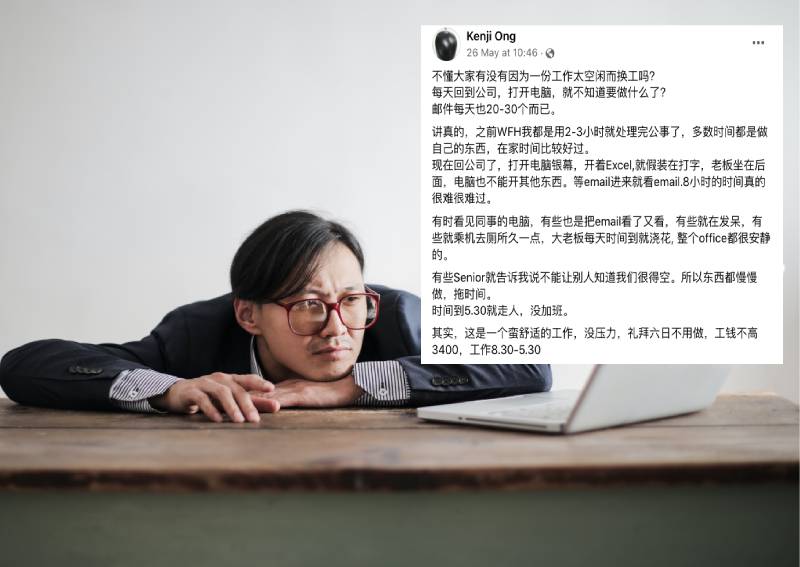 Kenji Ong, một nhân viên văn phòng ở Singapore, sở hữu mức lương 3.400 dollar Singapore/tháng đã khiến dân tình chưng hửng ít nhiều khi đòi bỏ việc với lý do "ối giời ôi": quá rảnh. Theo Asia One, dù đem lại mức thu nhập ổn định song anh chỉ cần 2-3 tiếng mỗi ngày để có thể hoàn tất công việc, khiến mọi thứ trở nên nhàm chán, nhất là sau đại dịch COVID-19.
