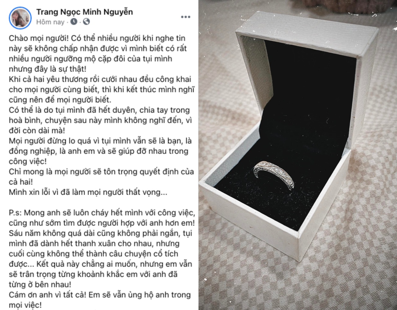 Bài đăng thông báo ly hôn của Lương Minh Trang. Nữ ca sĩ cho biết, cô và thành viên FAPtv đi đến quyết định ly hôn trong hoà bình và giữ mối quan hệ bạn bè, đồng nghiệp sau 4 năm chung sống. Lương Minh Trang viết: "Khi cả hai yêu thương rồi cưới nhau đều công khai cho mọi người cùng biết, thì khi kết thúc mình nghĩ cũng nên để mọi người biết.