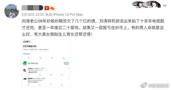 Lưu Đào bán mạng 1 năm nhận 10 bộ phim, thậm chí có năm lên đến 20 bộ để trả nợ cho chồng. Kết quả tên này lại va vào thị trường tiền ảo. Mấy người nói coi tên đàn ông này mạng sao tốt vậy? Có đại mỹ nữ sinh con cho, còn trả nợ thay”.