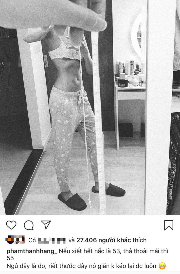 Điển hình như siêu mẫu Thanh Hằng vừa tự tin khoe vòng eo con kiến và số đo nhỏ đến "siêu thực". Vòng 2 của cô nàng ở thì hiện tại là 53cm khi được "siết chặt". "Nữ hoàng nội y" Ngọc Trinh cũng chẳng kém cạnh với vòng eo từ 56cm rớt xuống còn khoảng tầm 54cm. Nữ ca sĩ trẻ Han Sara cũng không kém cạnh các đàn chị với vòng eo 53cm. Nối tiếp danh sách là Chi Pu, Khả Ngân với vòng hai dưới 55cm.