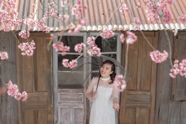 Tuy nhiên, khi được "mục sở thị" sắc hồng thắm từ những cây mai anh đào trên đường đến Trại Mát, Bảo Trân không khỏi trầm trồ trước khung cảnh lãng mạn của xứ sở ngàn hoa. "Tức cảnh sinh tình" nên thần thái khi chụp cũng đẹp hơn rất nhiều so với bình thường.