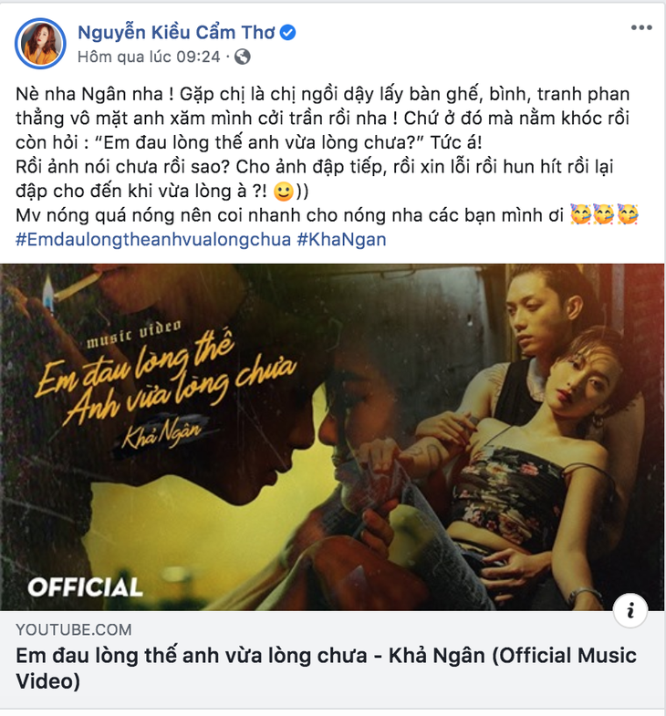 Khả Ngân đầy khác lạ trong MV Em đau lòng thế anh vừa lòng chưa.Đặc biệt hơn, sau hơn 2 ngày MV Em đau lòng thế anh vừa lòng chưa ra mắt, Khả Ngân còn nhận món quà bất ngờ từ dàn nghệ sĩ đình đám Vbiz. Đó là hoa hậu Mai Phương Thúy, ca sĩ Hoàng Thùy Linh, Gil Lê, Phạm Quỳnh Anh, Jun Phạm, diễn viên Diệu Nhi, Puka đã thực hiện clip reaction MV theo phong cách không thể độc đáo hơn. Đây cũng là lần đầu tiên các nghệ sĩ reaction một sản phẩm âm nhạc, nên mọi phản ứng đều rất chân thật, khách quan.