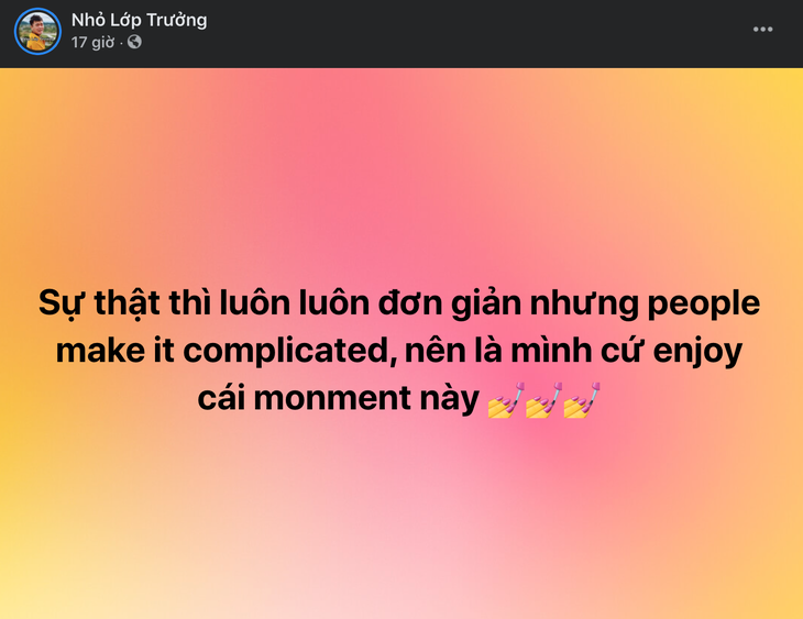 Giữa dòng chảy "nửa Tây nửa ta" vô cùng bắt tai ấy, dân tình rút ra được một câu nói có khả năng tạo trend cực đỉnh là "Make it complicated, enjoy cái moment này" (tạm dịch: Cứ làm quá lên, hãy cứ tận hưởng cái giây phút này - PV).