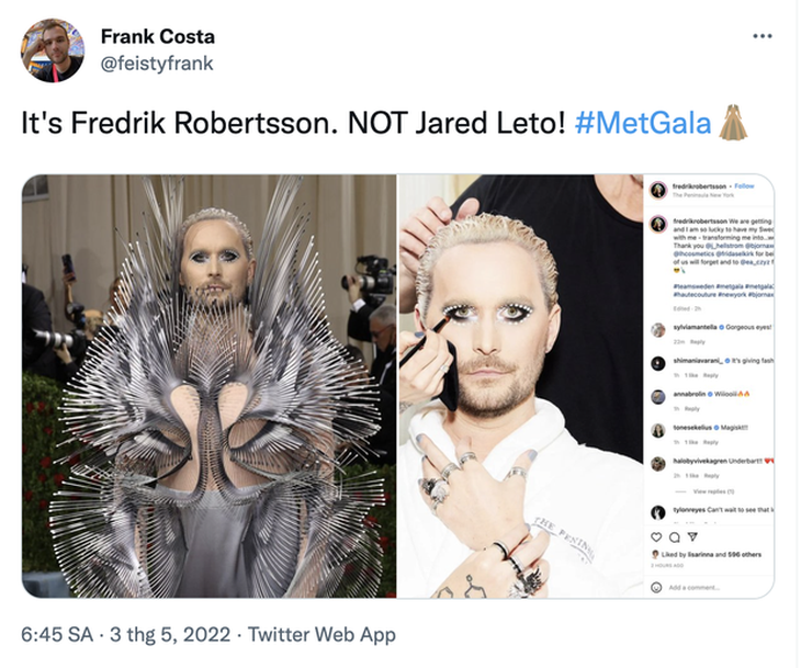 Nếu để tổng kết, chắc hẳn màn hóa trang thành Jared Leto của Fredrik Robertsson hẳn sẽ để lại ấn tượng mang tính lịch sử hơn cả của sự kiện thời trang Met Gala này.