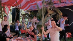 'Hoa cưới bay lên tầng hai rồi, các bạn còn ế dài nhé', cô dâu said.