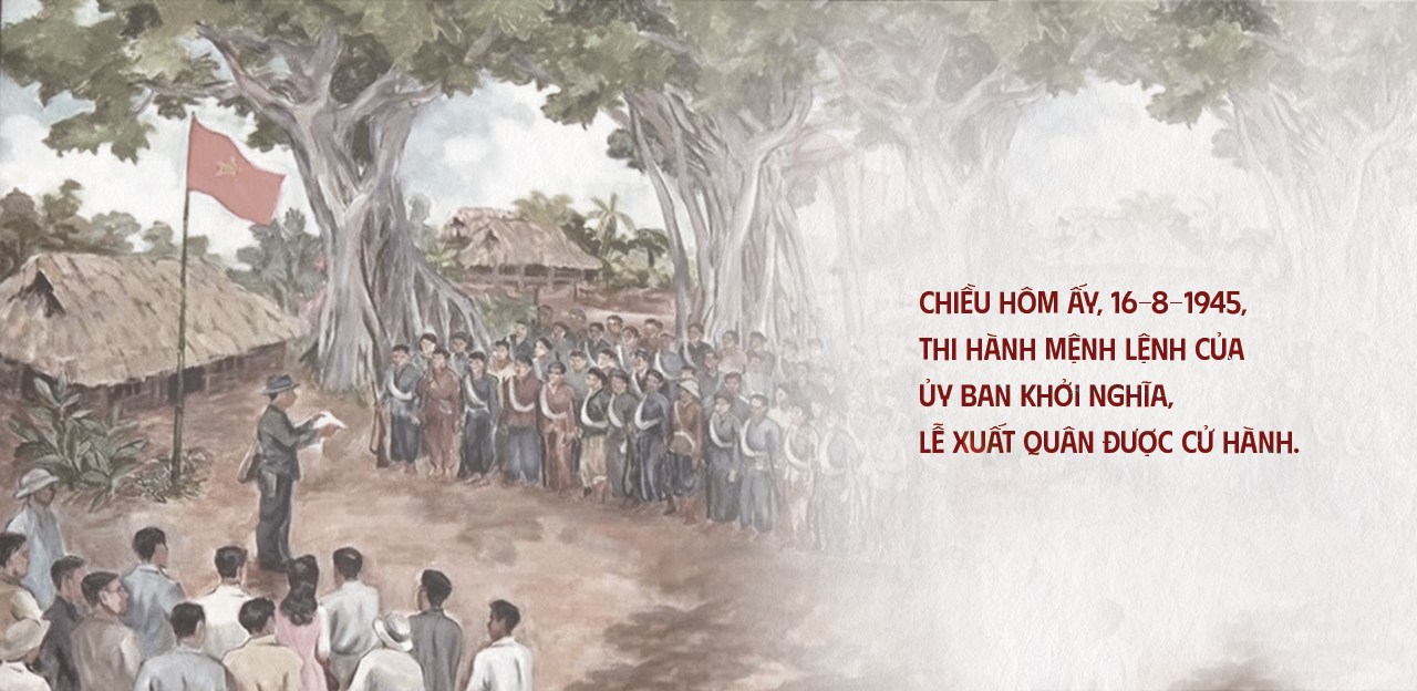 Gần 200 chiến sỹ Quân giải phóng đứng thành hai hàng dọc, trước mặt là lá cờ đỏ sao vàng năm cánh bay phấp phới, các đại biểu về dự Quốc dân Đại hội và nhân dân Tân Trào đến dự và tiễn đưa đoàn quân giải phóng.