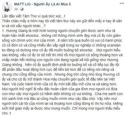 Tâm thư được cho là Matt Liu viết cho Hương Giang đăng trên fanpage của Người ấy là ai mùa 3Xì-căng-đan của Hương Giang và anti fan vẫn chưa có dấu hiệu hạ nhiệt sau 3 ngày bùng nổ. Làn sóng tẩy chay nàng hậu đang rầm rộ và quyết liệt hơn. Giữa lúc căng thẳng, cộng đồng mạng lại xôn xao về tâm thư bênh vực Hương Giang của doanh nhân Matt Liu đã đăng tải trên fanpage Người ấy là ai mùa 3.