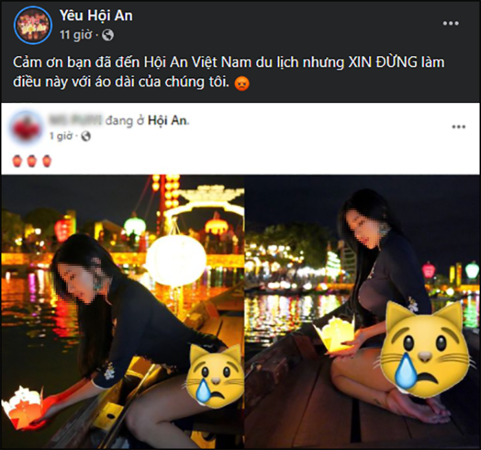 Fanpage đăng đàn bức xúc trước những hình ảnh phản cảm mà mẫu nữ nổi tiếng chụp tại Hội An. (Ảnh chụp màn hình) Hành động kém duyên với áo dài nói riêng và không gian công cộng nói chung của mẫu nữ nhận không ít "gạch đá" từ cư dân mạng Việt Nam. Không ít người chỉ trích, phê phán cô gái "Tưởng làm vậy là đẹp".