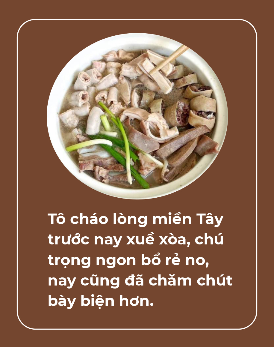 Nồi cháo lòng miền Tây nấu lỏng, rời rạc (dù gạo rang hay gạo trắng), trong khi cháo gu Bắc nấu nhừ, lỏng mà nhừa nhựa.