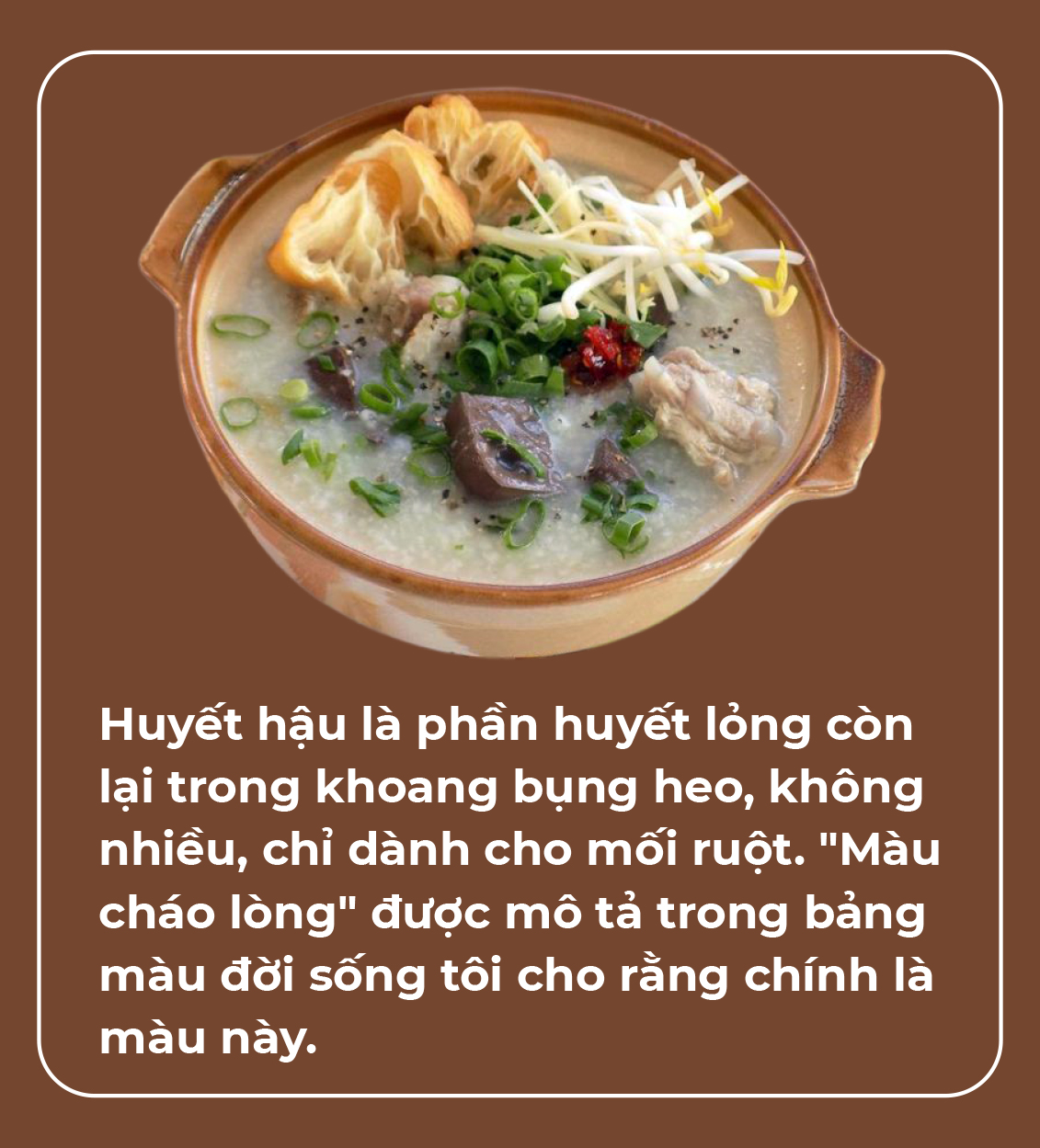 Tô cháo 25 ngàn có màu vàng nâu ửng hồng, điểm xuyết huyết hậu. Người sành ăn cho rằng cháo lòng nấu với huyết hậu vừa ngon vừa bổ.