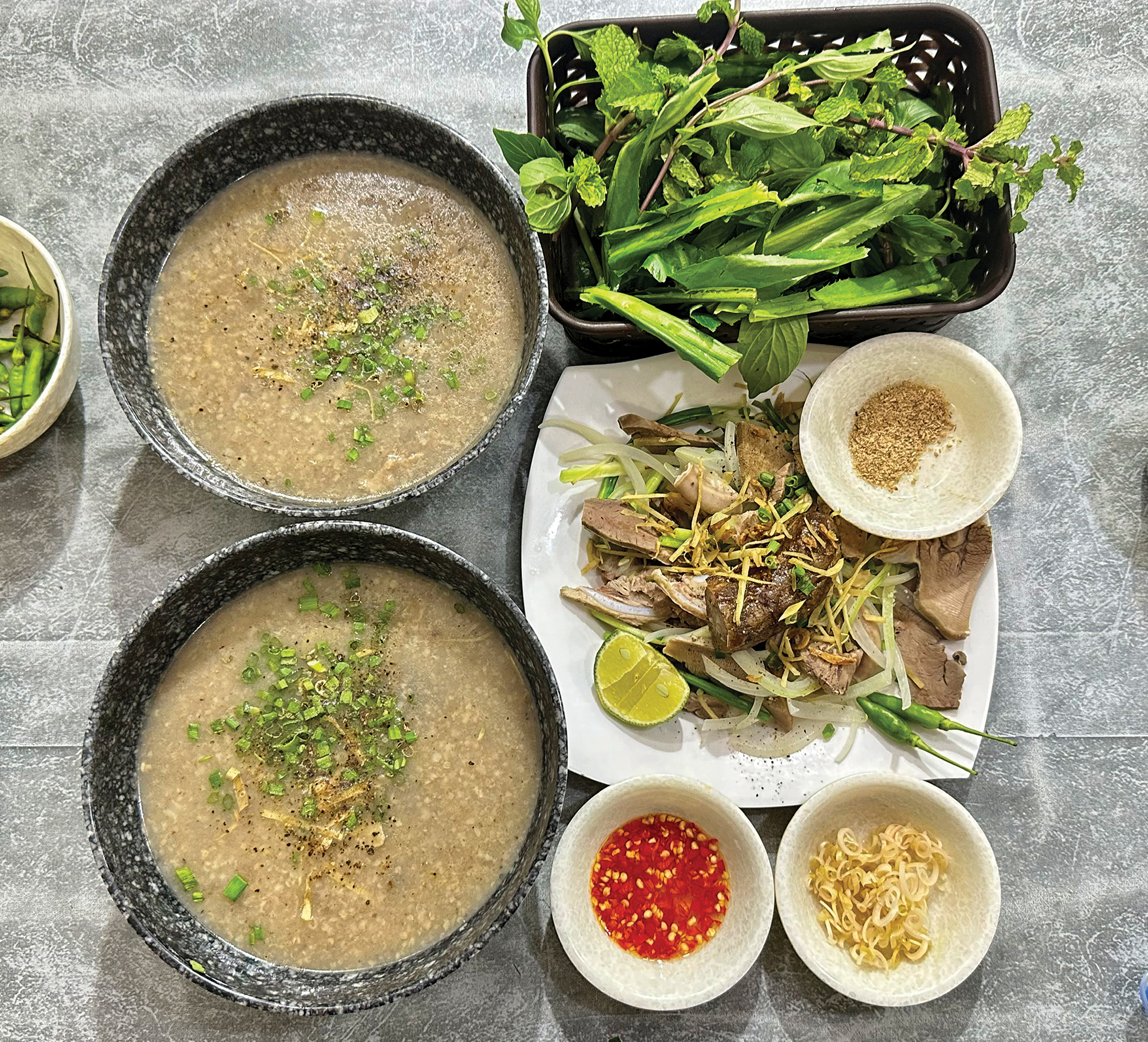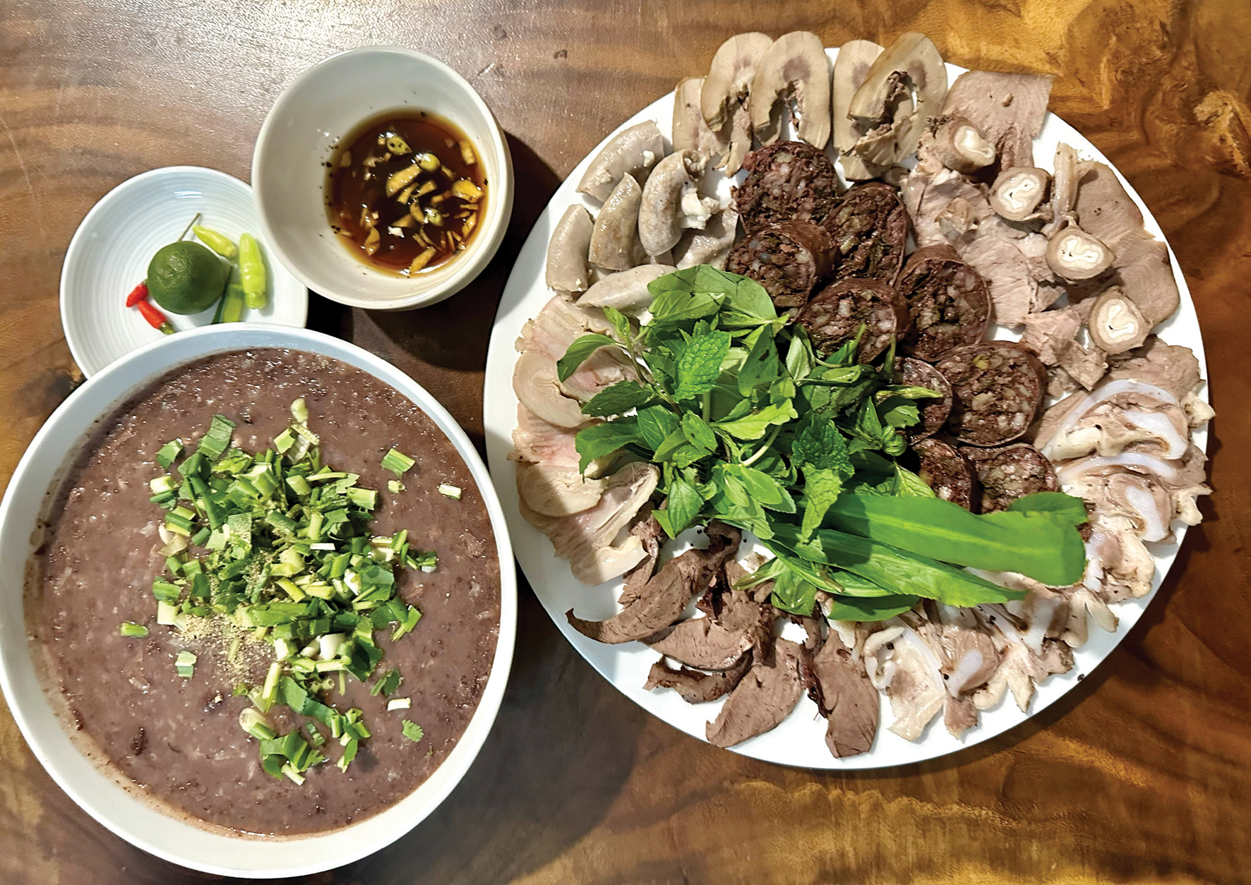 Dĩa rau đúng chuẩn cháo lòng là phải có giá sống, rau má, hẹ và rau đắng, bày biện trịnh trọng kế hũ nước mắm, hũ tiêu xay, chén ớt bằm và dĩa chanh xắt sẵn.
