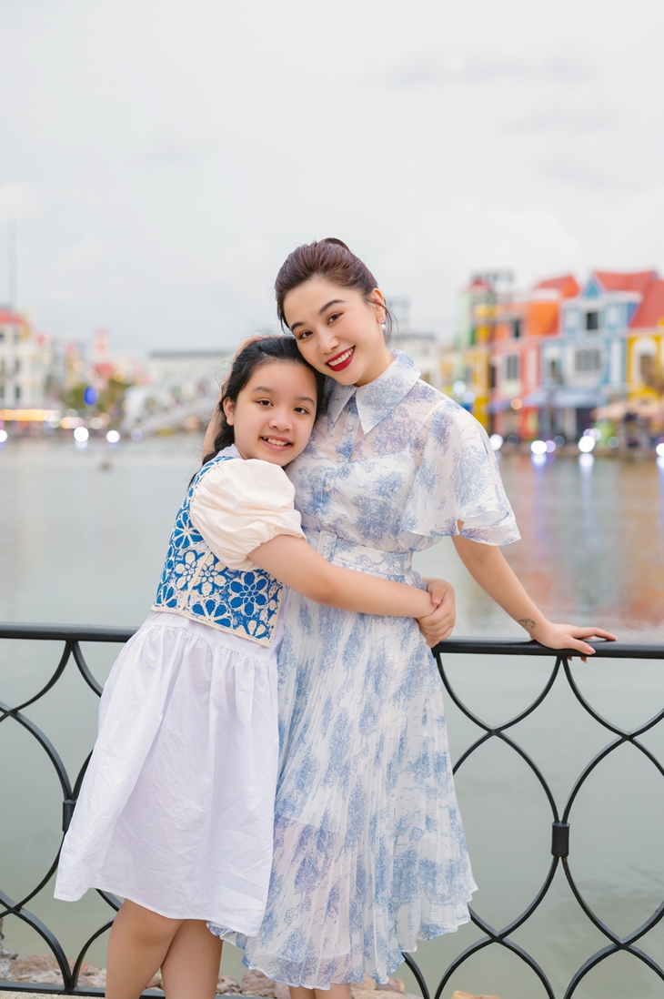 Nữ MC chọn chiếc đầm trắng thanh lịch khoe nhan sắc trẻ trung rạng rỡ. Bên cạnh mẹ, con gái của Anh Thơ chọn chiếc đầm hồng xinh xắn, tóc búi hai bên vừa tinh nghịch lại vừa đáng yêu. Bé Thỏ mới 11 tuổi nhưng đã cao lớn phổng phao gần bằng mẹ mình.