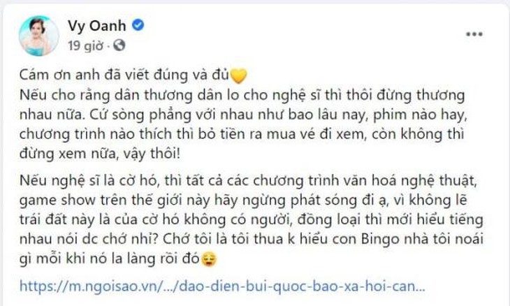 Ngoài MC Quốc Bình, ca sĩ Vy Oanh cũng bày tỏ sự đồng tình và cảm ơn đạo diễn Bùi Quốc Bảo đã nói hộ tiếng lòng của các đồng nghiệp: "Cám ơn anh đã viết đúng và đủ. Nếu cho rằng dân thương dân lo cho nghệ sĩ thì thôi đừng thương nhau nữa.