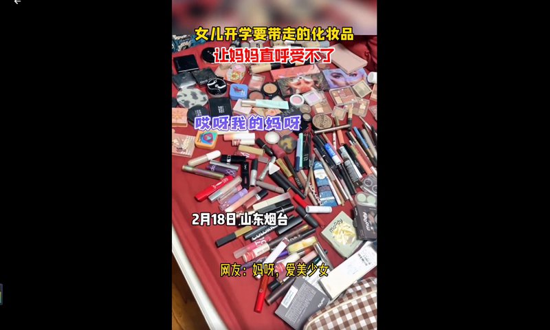 Cả trăm món mỹ phẩm được bày la liệt trên giường ngủ nữ sinh.Đoạn video được người mẹ quay lại và đăng tải lên mạng xã hội, ghi lại khung cảnh chiếc giường chứa đầy các sản phẩm mỹ phẩm đã trở nên viral rộng khắp. Được biết, hành trang đến trường của nữ sinh này "có hơn 60 cây son môi, 20 lọ kem nền, 40 cây chì kẻ lông mày và rất nhiều kính áp tròng". Người mẹ cảm thấy lòng như tan nát...