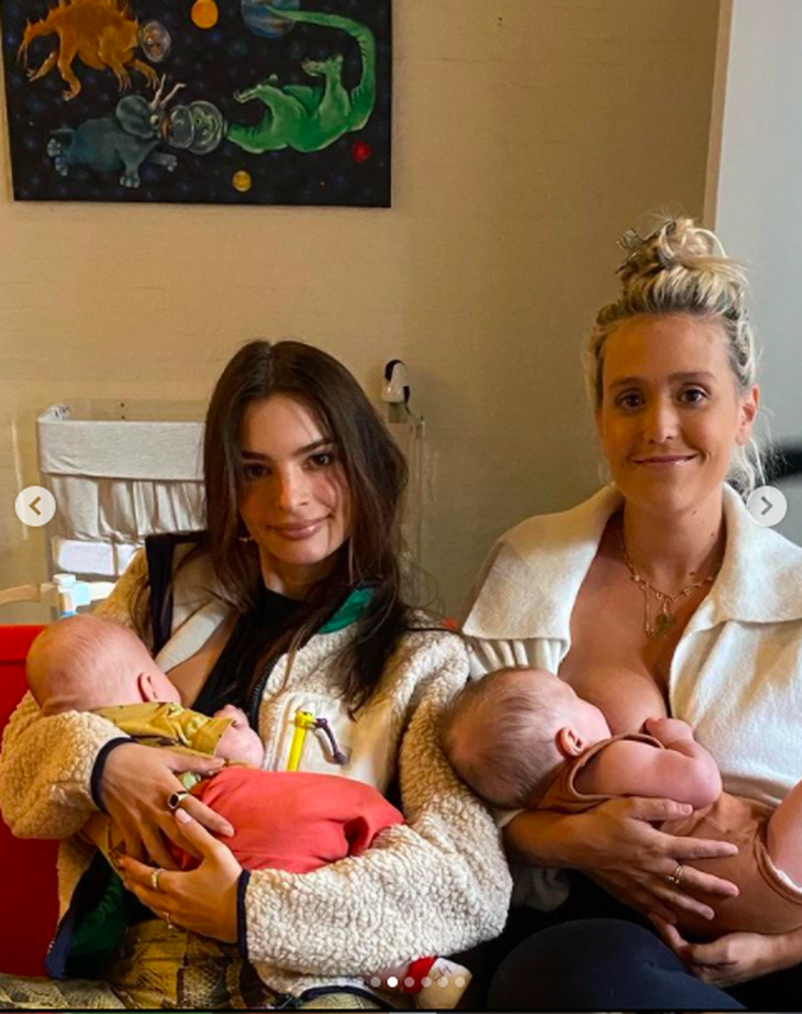 Hay thiên thần nội y Emily Ratajkowski (Mỹ) cũng nhận không ít chỉ trích khi đăng tải tấm ảnh cho cậu con trai Sylvester bú khi đang ngồi cạnh cô bạn thân Caitlin King, cũng đang cho con mình ngậm bầu sữa.
