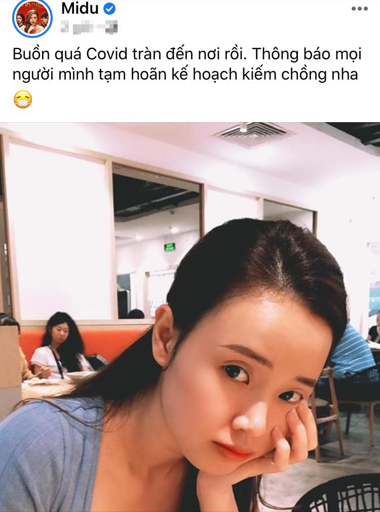 Dòng trạng thái thông báo tạm hoãn kiếm chồng của MiduCách đây ít giờ, diễn viên Mẹ chồng bất ngờ thông báo kế hoạch hoãn tìm chồng trên trang cá nhân nhưng lý do mới khiến công chúng bất ngờ. Midu hài hước: "Buồn quá Covid tràn đến nơi rồi. Thông báo mọi người mình tạm hoãn kế hoạch kiếm chồng nha!".