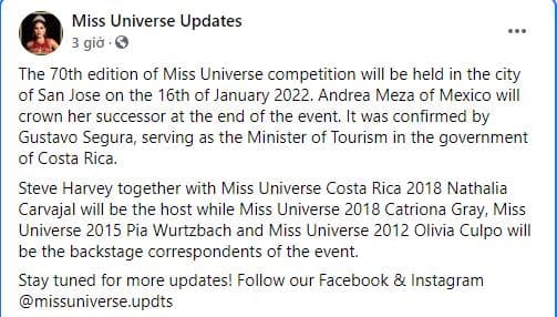Tuy nhiên, chỉ sau vài ngày, thời điểm diễn ra Miss Universe 2021 đã thay đổi vì dịch COVID-19 vẫn diến biến phức tạp trên toàn thế giới. Theo xác nhận từ Bộ trưởng Bộ Du lịch Costa Rica, cuộc thi vẫn sẽ được tổ chức tại thành phố San Jose của nước này, nhưng thời gian sẽ bị đẩy lùi sang tháng 1-2022.