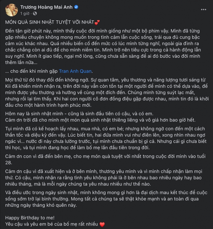 Trương Hoàng Mai Anh bày tỏ niềm hạnh phúc và cho biết sự xuất hiện của con chính là món quà sinh nhật thiêng liêng và vô giá nhất đối với mình.