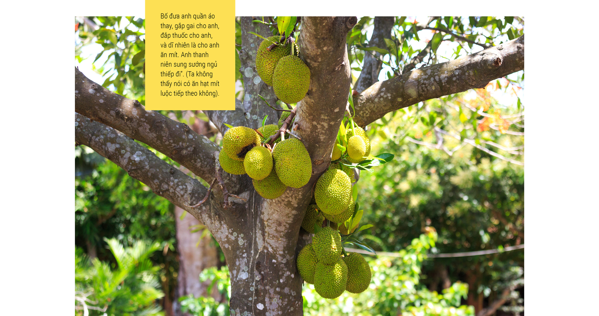 Những vết gai đâm, vảy cắt, kiến cắn, ong đốt như quay lại tra tấn cùng một lúc. Áo quần tả tơi, da dẻ toe toét máu, về đến nơi, anh thấy bố đang ngồi đợi mình với quả mít chín. Không nói không rằng, thanh niên lao tới chân bố.