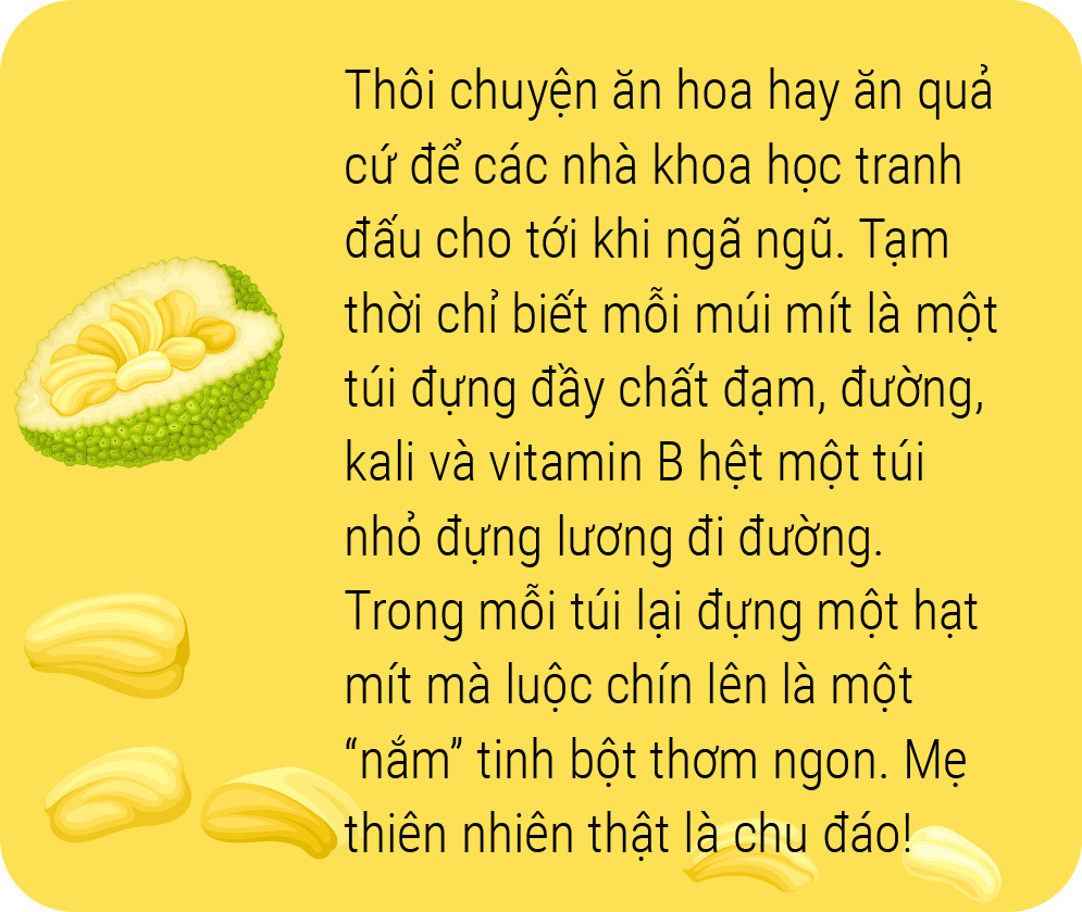 Quả mít gồm hàng trăm (và thậm chí hàng ngàn) bông hoa riêng lẻ hội tụ. Múi mít ta ăn chính là những cánh hoa dày thịt bao quanh hạt, và hạt ấy mới là quả thực thụ.