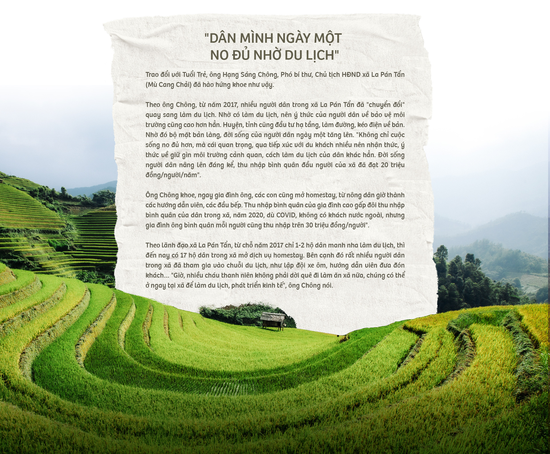 Bí thư huyện ủy Mù Cang Chải, ông Nông Việt Yên và chủ tịch UBND huyện, ông Lê Trọng Khang đưa cho chúng tôi xem bản "Đề án xây dựng huyện Mù Cang Chải thành huyện du lịch giai đoạn 2021-2025 và định hướng đến năm 2030" và nhấn mạnh: Đây là quyết tâm của cán bộ và nhân dân trong toàn huyện, phải nhìn rõ tiềm năng của Mù Cang Chải để phát triển.