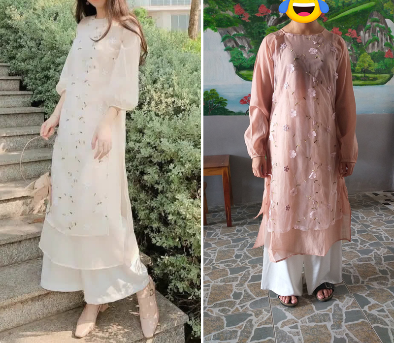 Cô gái "khoe" ở nhà sắm đồ Tết, cụ thể là chiếc áo dài (hình trái), thế nhưng sau cùng nhận được cái kết như hình phải.Theo lời kể, cô gái cho biết bản thân cao 1,5 m, trong khi đó, mẫu cao 1,65 m. Thiết kế có phần tay lửng nhưng khi nhận được hàng, cô chưng hửng với chiều dài của tay áo. Thậm chí, điều đơn giản nhất "đập" vào mắt mọi người là màu sắc của chiếc áo dài quá khác so với ảnh được shop cung cấp.