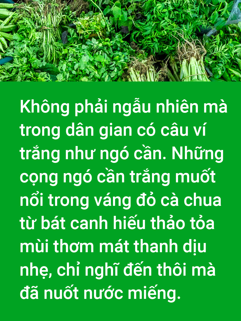 Không biết bát canh cần cô gái mang biếu cha mẹ đẻ trong ca dao có khúc cá quả nào không nhưng cần là loại rau chín nhanh. "Cần tái cải nhừ" là bí quyết nữ công gia chánh truyền đời, và dứt khoát phải ăn nóng.