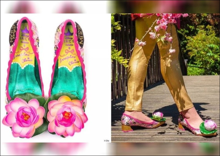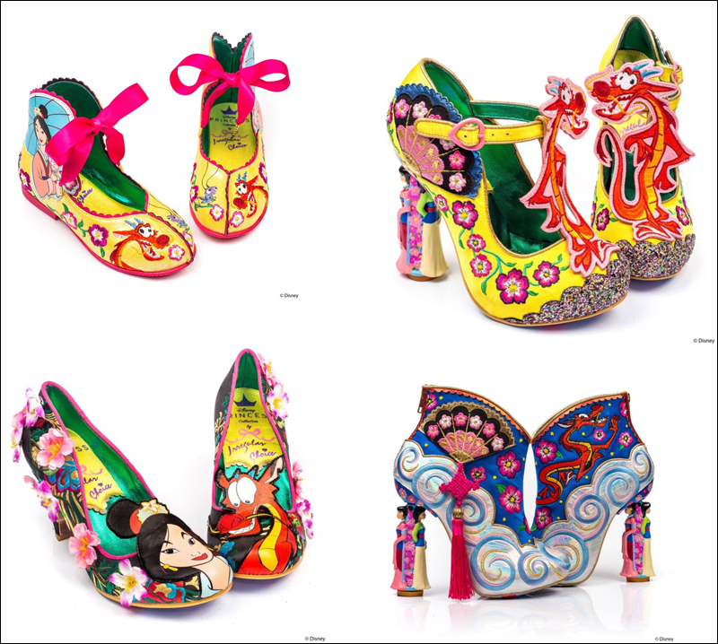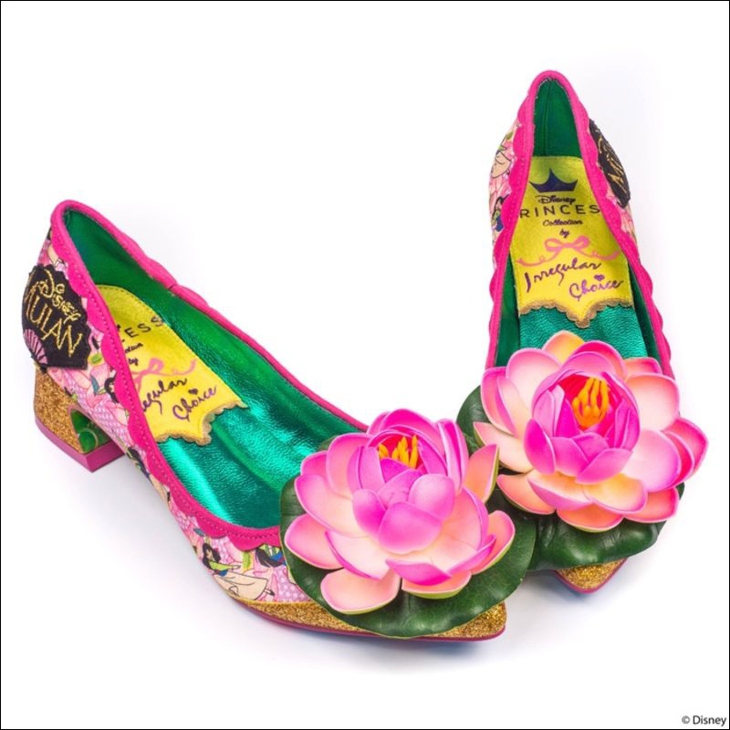 Màu sắc Á Đông đậm nét trên đôi giày được hãng Disney hợp tác cùng Irregular Choice.Những đôi giày thuộc dòng sản phẩm này có giá dao động từ 85 - 245 bảng Anh (khoảng 2,5 - 7,5 triệu đồng) tùy item. Bộ sưu tập này gồm 6 đôi giày, sử dụng những màu sắc vô cùng sặc sỡ, đậm yếu tố Á Đông như: mây, hoa sen, quạt giấy, đỗ quyên... Điểm nhấn đặc biệt chính là hình ảnh Hoa Mộc Lan cùng với chú rồng Mushu tinh nghịch, lém lỉnh.